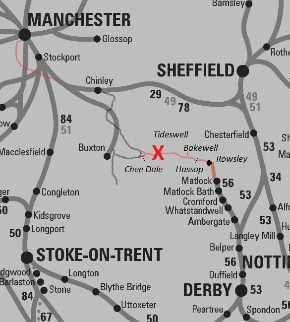 On the map below: passenger lines (currently open) are shown in black; freight-only lines (currently open) are shown in red; the Monsal Trail, between Chee Dale and Bakewell, is shown in green; the “Peak Rail” heritage line between Matlock and Rowsley is shown in brown.