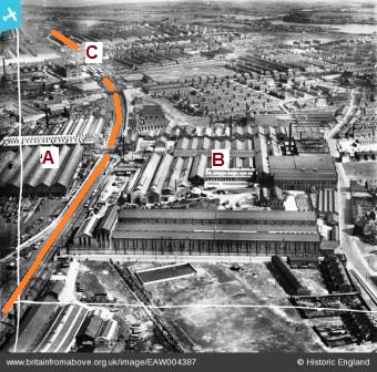 Gorton station (C) is near the top of the picture and the factories were located just to the west of it. On the north side of the tracks (highlighted in red) was “Gorton Tank” (A), opened in 1848 by the Great Central Railway and eventually passed to successors LNER and British Railways. The factory constructed, maintained, and even scrapped locomotives until its closure in 1963. Today the site is occupied by New Smithfield Market.