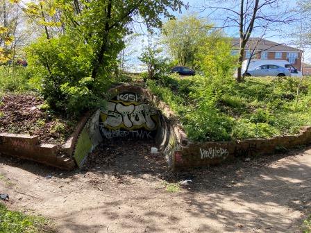 Cross Bunns Lane and enter Lyndhurst Park. Walk through the park along its northern edge. The old track bed can be accessed here along to the right, but it is covered in thick undergrowth.
