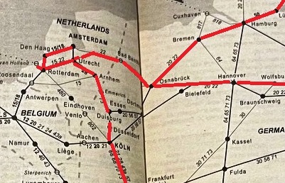 The routes can be seen above highlighted in red on a Thomas Cook timetable from the 1980s. A similar pattern of connecting services waited for the evening arrival of the day crossing from Harwich too. Even at the height of the cold war there were through coaches that went all the way to Moscow.