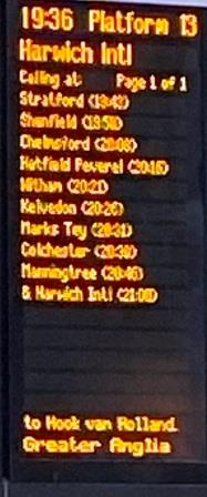 I am catching the 19:36 train direct to the port of Harwich or ‘Harwich International’ as it is now known. Although the train fits into the regular hourly pattern of services as far as Colchester, it is extended from there to Harwich International specifically to connect with the sailing. It is one of only four daily through trains to Harwich International from London.