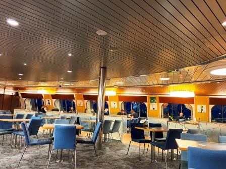 I drop my bag and immediately go for a wander. The ship has recently been refurbished and has a nice bright feel to it. There don’t seem to be too many people travelling tonight though. I have a small beer in the observation bar. Apart from a few motorcyclists eating curry in the adjacent restaurant the whole place is pretty deserted.