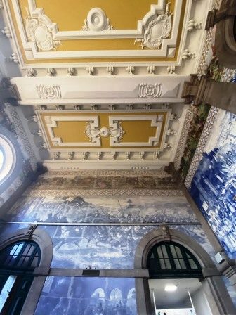 The tiles show landscapes as well as historical events such as the Battle of Valdevez (1140), the arrival of King John I in Porto (1387) and the Conquest of Ceuta (1415).