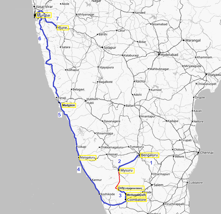 In mid-January 2026 I would fly to Bengaluru (1). After a few days wandering around the city, I would catch the train to Mysuru (2) and during my stay visit the railway museum there. A few days later I planned to travel on the Nilgiri Mountain Railway (3) before heading to Coimbatore Junction to board an express to Mangaluru (4). I would then make my way up the coast on the Konkan Railway first to Madgaon, Goa (5) and then on to Mumbai (6). My final train would be the Deccan Express from Pune (7).