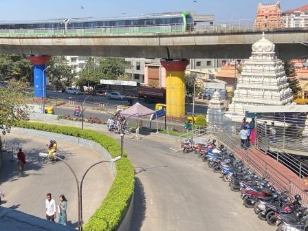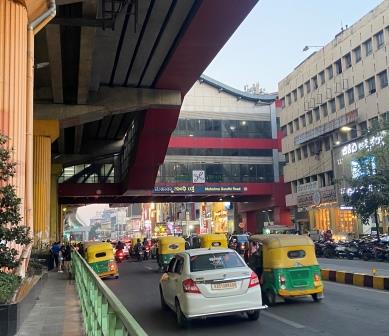 The Metro tracks are elevated above MG Road and about halfway along is MG Road station itself. It is already a busy stop but it will soon become an interchange when the Pink Line (currently under construction) is completed.
