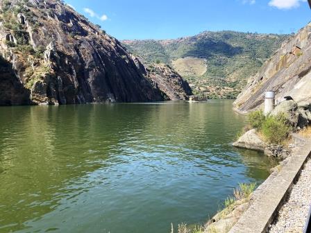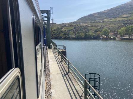 We passed through a long tunnel, and then after a few more minutes finally met the River Douro at Mosteiro (09:48). We started off high above it but gradually descended to its level. For the next 100km, for almost two hours, we would stay close to the river, most of the time on its northern bank.