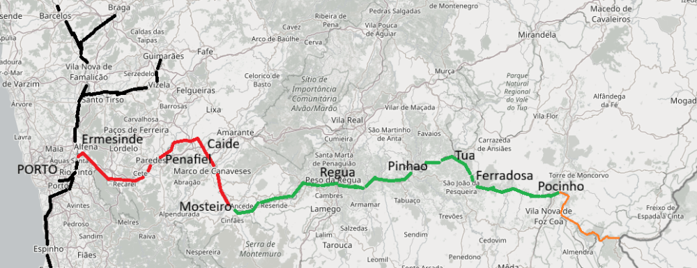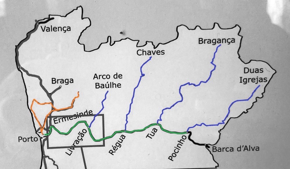 The Duas Igrejas branch was one of four metre gauge lines that used to connect with the Douro Valley Line. Shown in blue on the map below, the four, now defunct, branches each linked to the Iberian gauge line, shown in green, and were separate from one another.