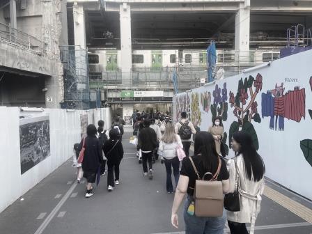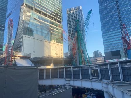 As I make my way gingerly through the construction site around the west side, I spot the old Ginza Line viaduct leading into the depot above me. It used to be busy with trains constantly leaving the station to turn around. Now most services reverse direction in the new station so seeing anything on this section are rare. Nevertheless, they have retained one line (leading from the northernmost platform) to connect with the depot, still enclosed in Mark City.