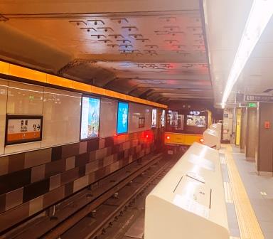 I get off at a couple of stations along the way just to have a look around and examine the design. The whole line is built to a smaller profile than the rest of the system and the low roofs can make it seem claustrophobic. Both the lines in the different directions are in the same tunnel but are separated by a system of steel girders and this seems to add to the constrained atmosphere.
