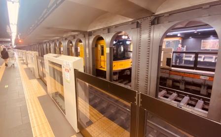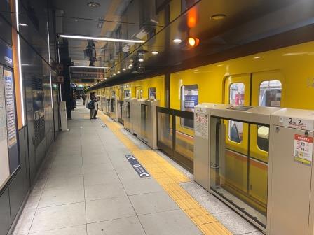 The stations between Shimbashi and Kanda and the new one at Tameike-sanno have island platforms, although those at Shimbashi and Nihonbashi have been augmented with extra side platforms. Omotesando and Akasaka Mitsuke both have double island layouts offering cross platform interchange to the Hanzomon and Marunouchi Lines respectively. The rest of the stations have side platforms.