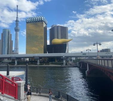 I reach the Sumida River and look across. The Asahi Beer buildings and Tokyo’s tallest structure, the Skytree (634 metres), dominate the modern scene. Back in 1902, the Tobu Railway, a commuter line, opened its first Asakusa terminal on the other side of this river. The current name of that station, “Tokyo Skytree” give a clue to its exact location.