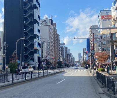 Now I start to walk up Asakusa-dori. I am amazed how quickly the neighbourhood has changed. The road is six lanes wide and it stretches in a straight line with tall buildings on either side. The Ginza Line, of course, is running directly below the suface.