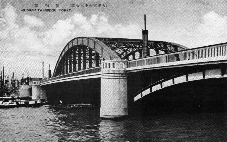 After a short stroll along Edo-dori, I come to a crossroads and, following the subway as it curves east beneath the surface, I turn right into Asakusa-dori. I will now follow it all the way to Ueno. As I turn, I glance towards the river on the left, this is Komagata Bridge. It was built in 1927 in an Art Deco style.