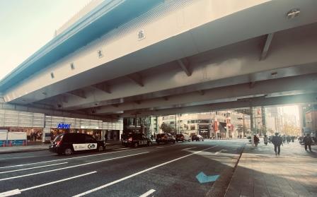 Ginza starts to fizzle out. I come to another expressway bridge. In a repeat of the scene at Kyobashi, as it crosses Chuo-dori it is following the route of another infilled canal.
