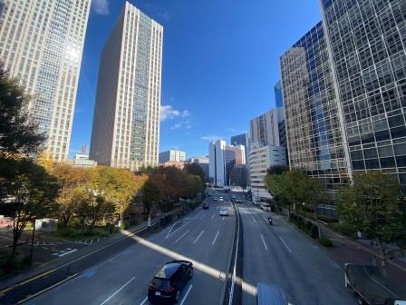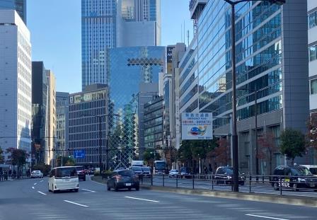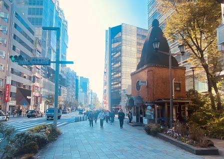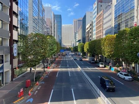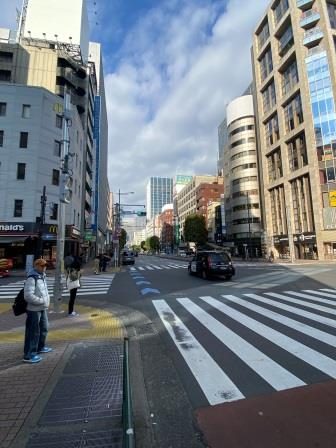 I cross over Hibiya-dori, one of Tokyo’s busiest north-south thoroughfares. On the other side of the crossing now, the cityscape has changed again. There are more office blocks, fewer shops and restaurants. There are trees lining the road too.