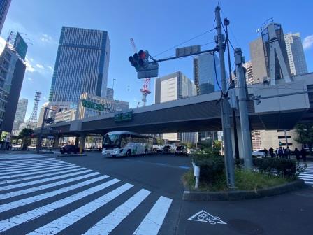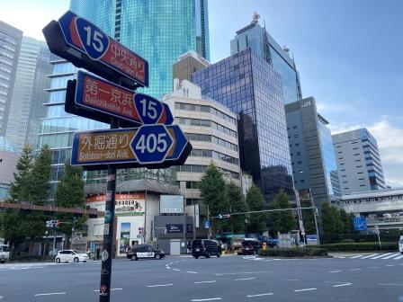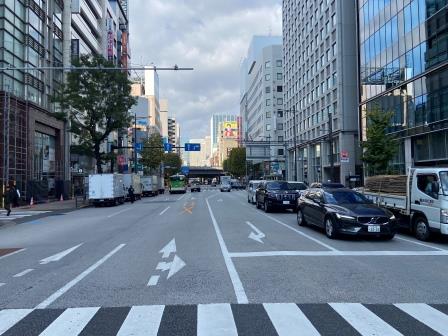 At the crossroads ahead, I turn right from Chuo-dori into Sotobori-dori. Under the surface, the Ginza line does the same thing, curving to the west to enter Shimbashi station.