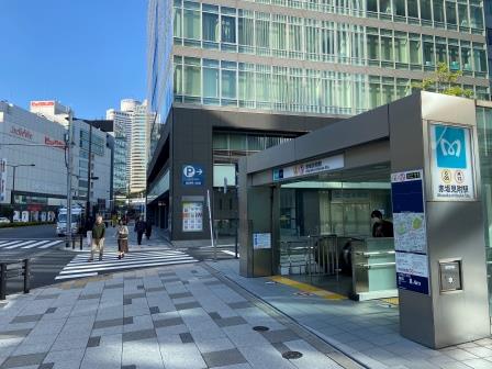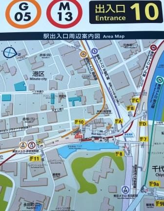 I go straight under the flyover and on the other side there is the first entrance to Tameike-sanno station, G6. This stop was added to the Ginza Line more recently to provide a changing point with the Namboku Line which arrived here on September 30, 1997.