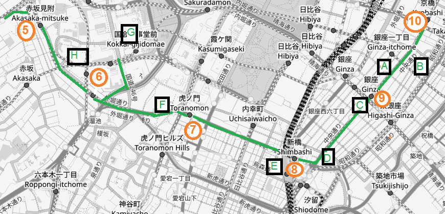 Walk to Shimbashi, G-08 (0.9 km / 8 km)