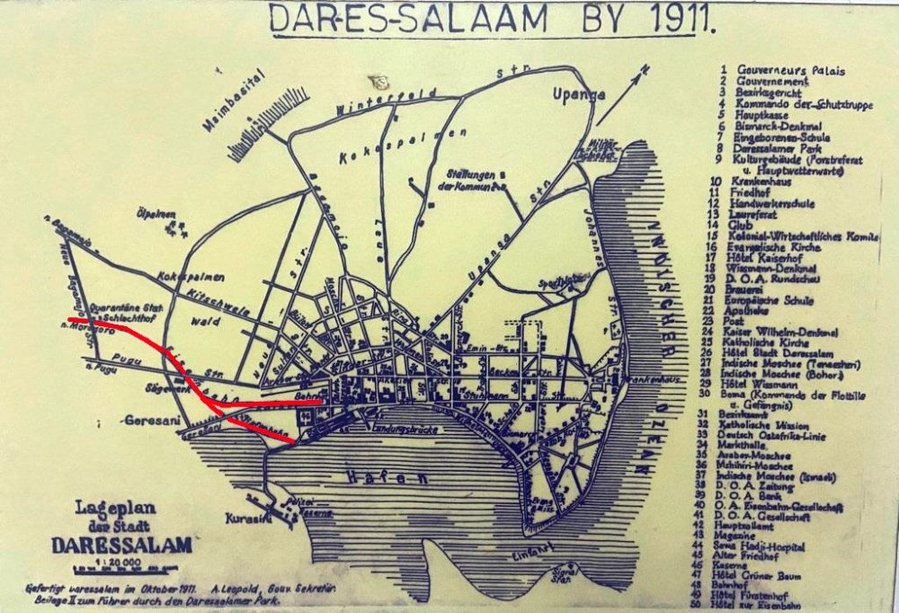 Tanzania’s Metre Gauge railway system (known today as MGR) dates from 1905 and extends to around 3,000km of route. It is one of the biggest legacies from the German colonial era. The original line terminated in what was then the edge of the downtown area with a short branch to the port. It is shown in red on the 1911 map below.