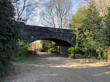 The pedestrian route by-passes the school and leads into Alexandra Palace Park. Further remains of the track bed can be seen in Alexandra Park, including the elegant underbridge in the photograph below.