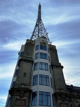 At the time it was considered necessary to have the transmitting antenna and the studios in one place. A tall transmitting mast was erected on top of the eastern tower; two studios, stores, make-up areas, dressing rooms and offices were created in the building below.