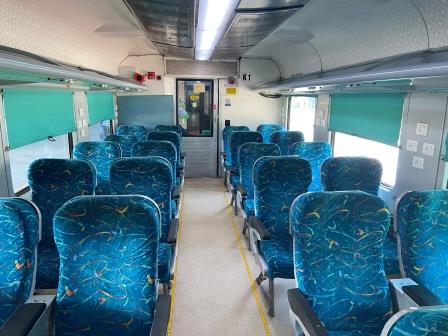 The Shatabdi finally arrived about twenty minutes behind schedule. Hauled by a WAP7 electric locomotive, the rake consisted of a generator van at the front, then twelve air-conditioned chair cars (C12 to 1), two regular executive cars (E2 and E1) and an Anhubuti Class coach (K1) ahead of another generator van at the back.