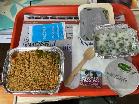 The Anhubuti fare included food and I had gone for the vegetarian option. A few minutes into the journey I got a tray with several cartons marked with the “Meals on Wheels” logo. There were packets of biriyani and raita, a tub of curd and some “Pass Pass” sweets. It was pretty good.
