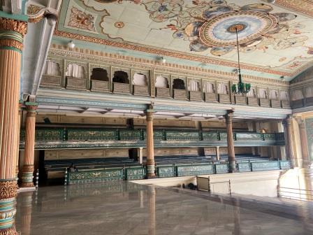 Inside, the Durbar Hall features ornate pillars and a large, open space for public audiences, whilst the Marriage Hall is known for its octagonal ceiling, peacock-themed stained glass, and mosaic floors.