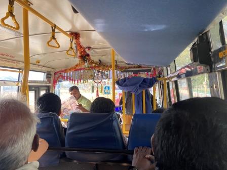 The driver seemed as if he was in a bit of a hurry and with constant honking on the horn he took every opportunity to overtake vehicles along the single carriageway road. To be fair though, he seemed to be good at his job and I never felt he was taking any unnecessary risks. After almost an hour and a half on the road, we made a brief stop in a parking lot at Bandipur. A few of the passengers got out and bought things from the “Bakery and Cool Bar” but most of us stayed on board to be entertained by a busker.