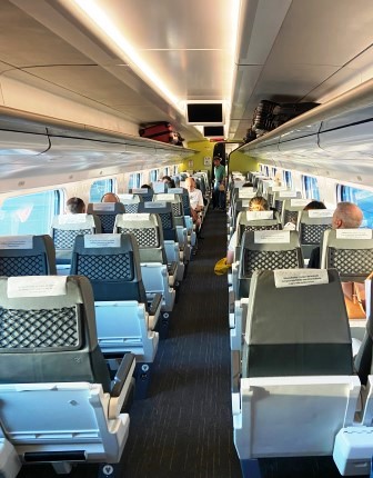 I found the bright interior pleasant and welcoming and the ride was comfortable. There was an on board speedometer and it occasionally reported speeds of 220km/h. This was quite impressive given that no conventional UK train, including the similar Pendolinos on the West Coast Main Line, ever manage anything above 200km/h.